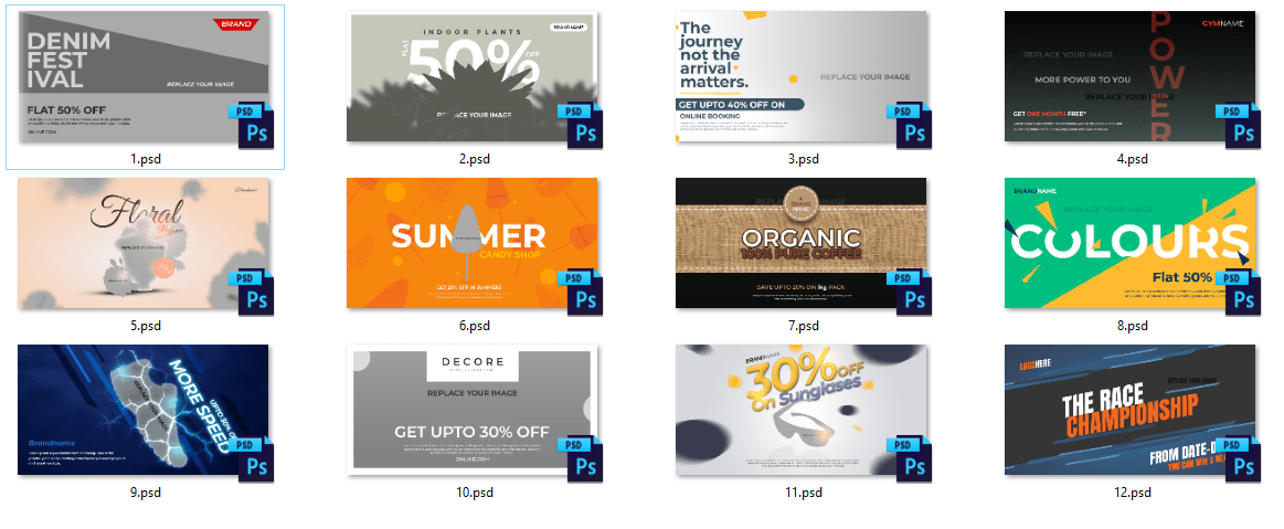 Promote your products and services with this great-looking Banner Set. These images are designed to meet Facebook & Instagram specs, less than 20% overlay text. 24 awesome quality banner template PSD files (12 Designs x 2 Sizes, 1200×628 and 1200×1200 each) ready for your Services, products, and campaigns. Each PSD file are layered and fully organized. The package also contains a help file & Editable PSDs.