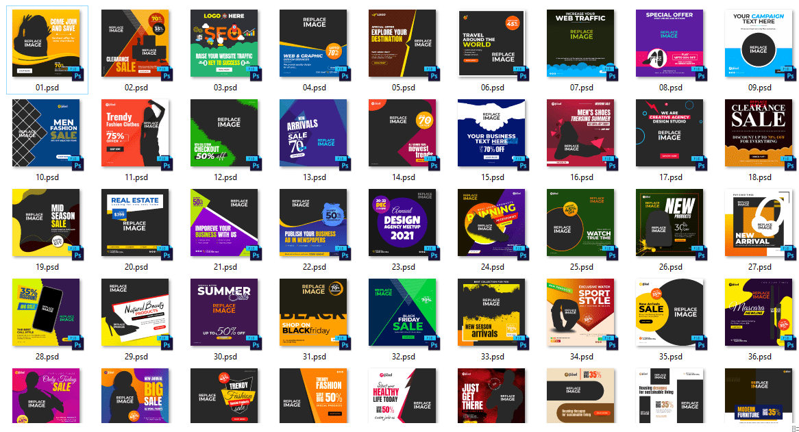 50 Instagram & Facebook Banners PSD templates are a creative and professional bundle for any kind of business that will suit perfectly for your company or personal Facebook & Instagram profile. Announce sales and special offers, show off new products, or promote yourself. Awesome quality creative template PSD files (50 Designs, 1200×1200px each) ready for your stories, post, business, services, products, foods sale, marketing, multipurpose campaigns.
