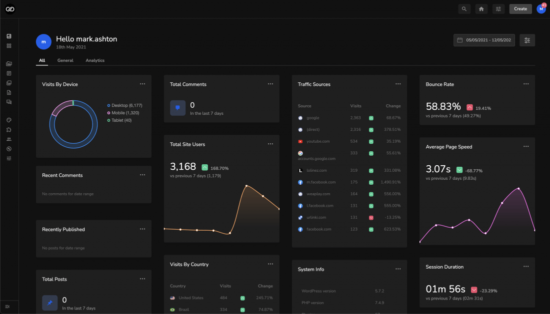 A clean and modern WordPress admin extension with a streamlined dashboard, Google Analytics and woocommerce Integration, powerful content library, dark mode, white label and much more.