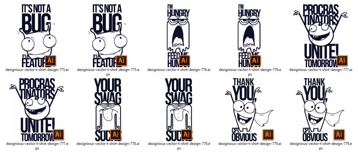 Set of 5 vectors with funny cartoon character for your personal T-shirt designs. Free for download. File format: .eps. File size: 2 Mb.
