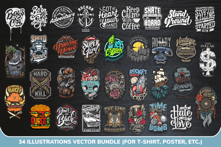 Set of 34 various illustrations for differents designs, posters, T-Shirt prints etc.