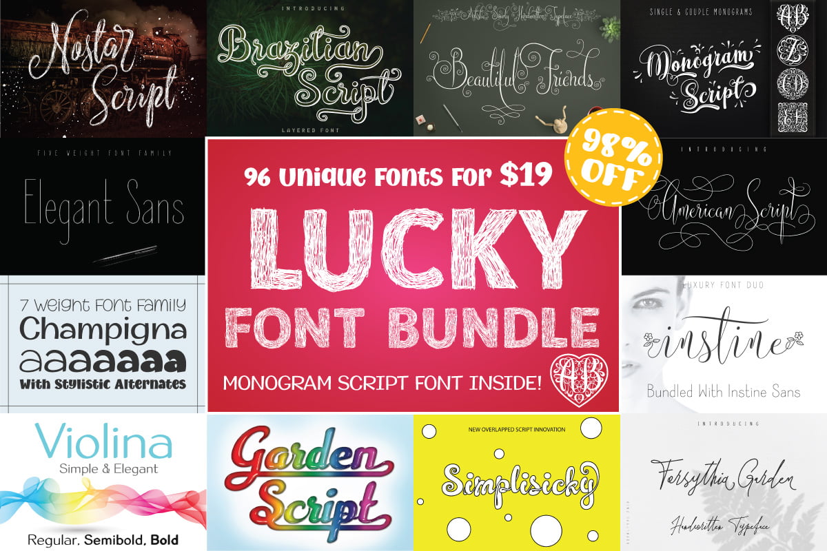 The Lucky Font Bundle is here with 64 unique typefaces. A great selection of different and unique fonts, including children handwriting type, cursive script, calligraphy, brushed script, patterned display fonts, blackletters, 3D script, swirly handwritten and sans serif.