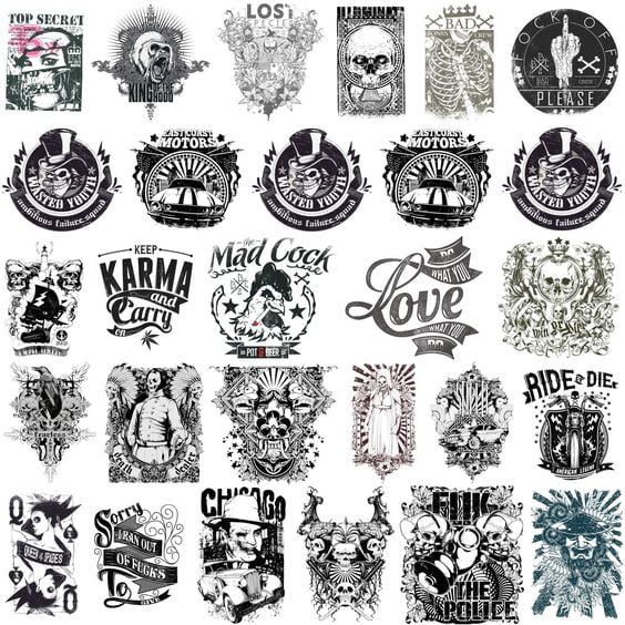 Set of vector scary t-shirt designs with bad bones, biker theme, inscriptions “Top secret”, “Lost Species”, “Illuminati”, “Bad”, “Wasted Youth”, “East coast Motors”, “The Mad Cock”, “Ride or Die”, “Keep Karma and Carry on” and other. In archive 25 files for your aggressive and scary print on t shirt.