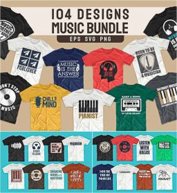 104 Music T-shirt Designs Bundle. You can print on a t-shirt, mug, paper, fabric, poster, canvas, and more merchandising according to your needs. 100% Vector, High Resolution. Ready to Print. For personal use.
