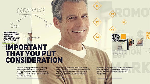 The project is based on dynamic lively typographics. The viewer sees typed texts on business promotion and handwritten lists and schemes as if just written by one of the partners at a business meeting. The main words are highlighted with big headlines in orange and black and with great letters on the background. Let the text support what you say using your photos.